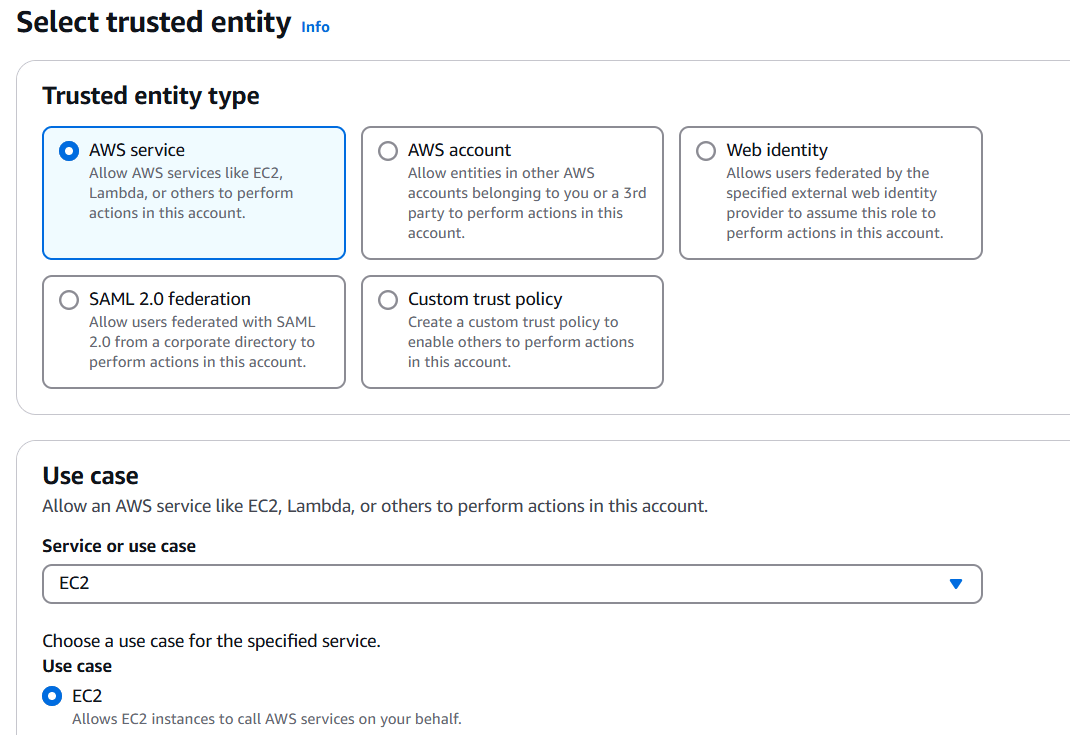 Log into AWS, navigate to the IAM Dashboard and press Roles and then Create role. Pick AWS Service as Trusted entity type and EC2 as use case. Press next and add these 3 permissions: