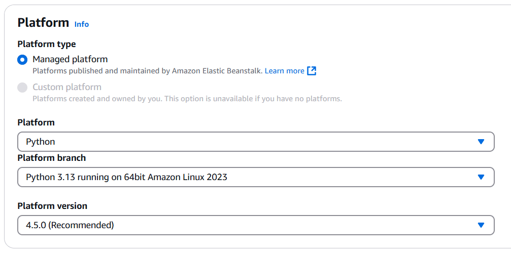 The press Create environment inside the app we just created. Choose Python and Amazon Linux 2023.