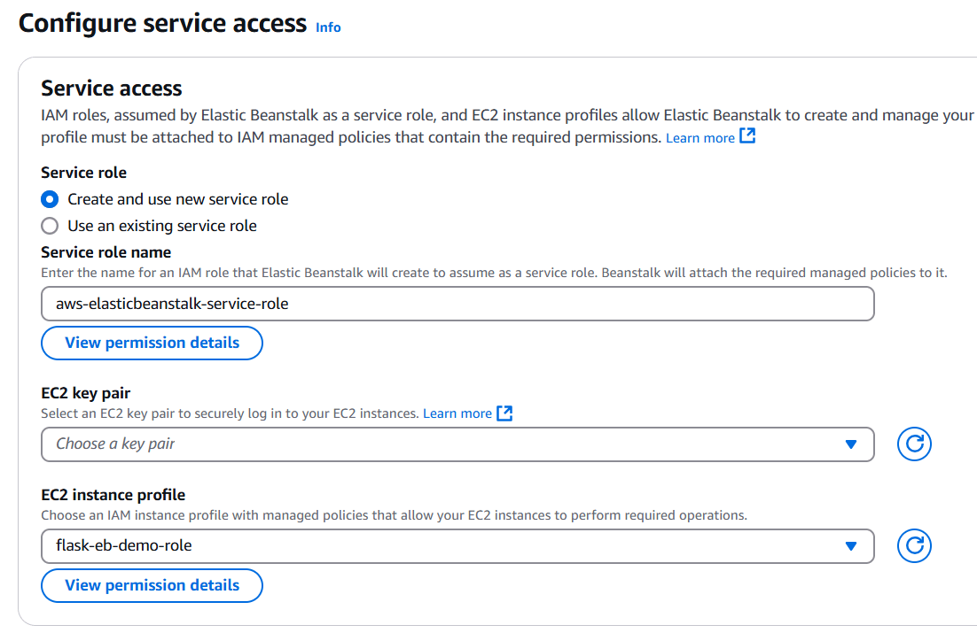 Press Continue until you end up at Configure service access. Pick Create and use new service role. Under EC2 instance profile, choose our newly created profile.